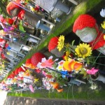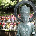 As I walked through the gate towards a seated stone Buddha I was fascinated by hundreds of tiny statues. These stone statues are called Jinzo (or Ksitigarbha in Mayahan Buddhist Bodhisattva tradition) and wear red bibs and hold colourful pinwheels which spin in the wind. The Jinzo in Japan is one of the most loved of all divinities. He is traditionally seen as the guardian of children, particularly children who died before their parents. He is seen as the savior of souls who have to suffer in the underworld and his statues are common in cemeteries. He is also believed to be the protective deity of travelers, and roadside statues of Jizo are a common sight in Japan. The hundreds of Zojoji Temple each represent a dedication to a lost baby’s life. Families dress these statues up, provide gifts and use them as a memorial towards their lost child.