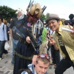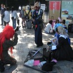 I was gitty with excitement when we arrived at the bridge. On the right side of the bridge stood around thirty cosplayers dressed as famous anime and manga characters. Several of them put on mock samurai sword battles. I ran into a bizarre character wearing a Transformers mask, holding a plastic semi-automatic weapon and dressed from neck to toe in manga attire. I gave him the thumbs up and said, “very cool.” And I was shocked that I received a “thank you,” in a thick Texan accent. Back home, Caucasian people obsessed with manga and anime typically fall into a nerdy category. I remember passing by the Anime and Manga Club at the University Club Fair every year in Guelph and cringed at the sorts of people who lived in these fantasy worlds. This misfit from Texas clearly fits in here (which I think is great) and ran around the bridge all day having his photo snapped with tourists. He insisted that Taka take a picture of me on my knees as he shot me in the head. I didn’t feel safe refusing such a request and the picture will always be cherished I assure you. On the other side of the bridge stood many Lolita girls dressed in pink, black, red and white, chitchatting and snapping pictures with tourists.