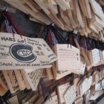 At the entrance stands a massive torii, a formal wooden gateway indicating that you are entering a sacred place. We crossed over a small bridge and walked up several gravel paths before arriving at a road flanked on both sides by colourful sake barrels. Arriving at the Shrine we stood by a masterful work of nature, a lush green ancient oak tree. Thousands of prayer plaques hung on boards which surround the tree. One prayer caught my eye and made me laugh, “Go Habs Go!” Oh Canada, sometimes I miss you. I was enjoying myself in a euphoric culture shock sort of way so grabbed a plaque and wrote, “The world is perfect at this very moment.”