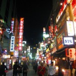 After dinner we skipped through the glowing streets buzzing with entertainment excitement. We walked past a Takifugu restaurant (the pufferfish which can notoriously kill you if it is not prepared correctly). The fish is highly toxic, but despite this, or perhaps because of it, it is considered a delicacy in Japan. Only specially licensed chefs can prepare and sell fugu to the public. The fish contains lethal amounts of the poison tetrodotoxin in the skin, liver and ovaries. Since small amounts of the poison give a special desired sensation on the tongue, certain parts are considered the most delicious by some gourmets. We pocked our fingers at the restaurants massive display tank. They didn’t look that harmless to me. Just don’t let their skin or ovaries touch you!