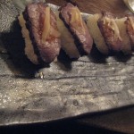 After several minutes of restaurant debate we found a lovely establishment underground. Arriving at the host desk we took off our shoes and walked into a locker room where we placed our sneakers and locked them for the duration of our dinner. I was incredibly excited as we walked through an upscale traditional Japanese restaurant. Diners sat on the floor, or on leather cushioned seats while their feet dangle under dug out spaces in the floor. Each private dining area in the restaurant was divided by paper wall sectionals. We were seated directly in front of the bartender at a mahogany table. We sat on our cushioned leather seats while our feet dangled underneath the table top. The ambiance was entirely calming, jazz music, dimly lit lighting and the beautiful rumble of Japanese table banter.