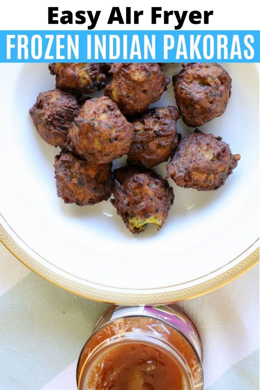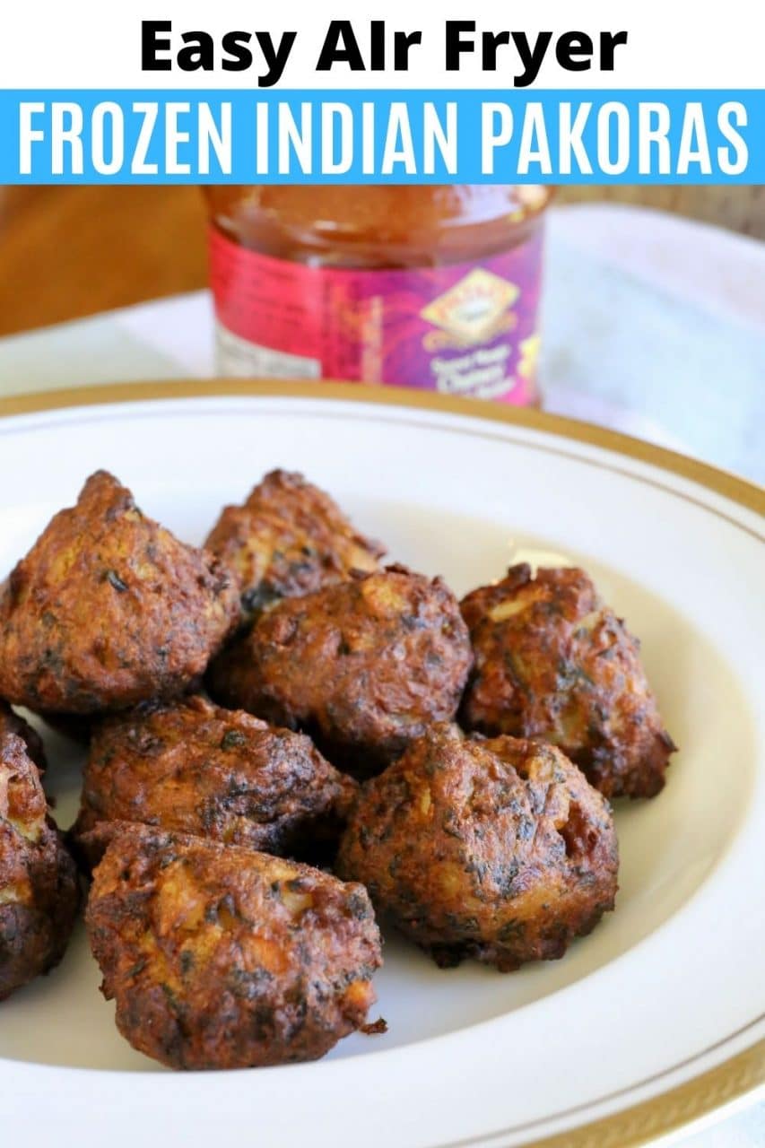 This simple air fryer recipe features frozen store bought onion bhaji pakoras and sweet or spicy Indian chutney for dipping.