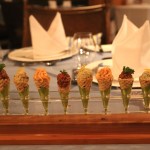 I hop up at the bar and moments later find myself sipping through my 20th (or so) Dark n Stormy. A gaggle of American golf journalists arrive just as a string of petite seafood cornette’s are placed before us. An attempt to amuse our mouths via delightful selection of wee ice cream cones stuffed with whispers of olive tapenade, salmon mousse and hearty crab.