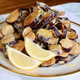 Before serving the crispy eggplant slices are drizzled with honey and sprinkled with lemon zest, flaky salt or sesame seeds.
