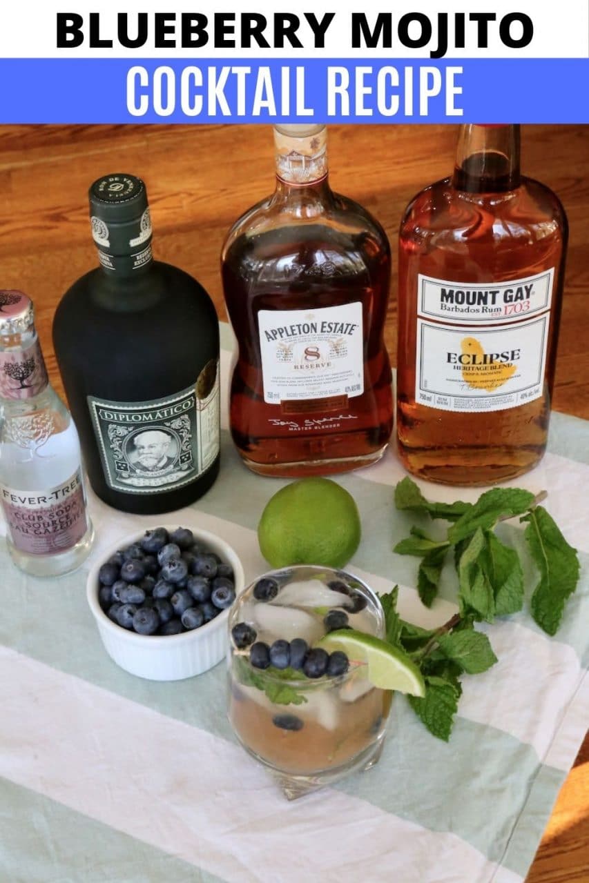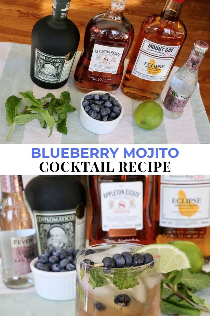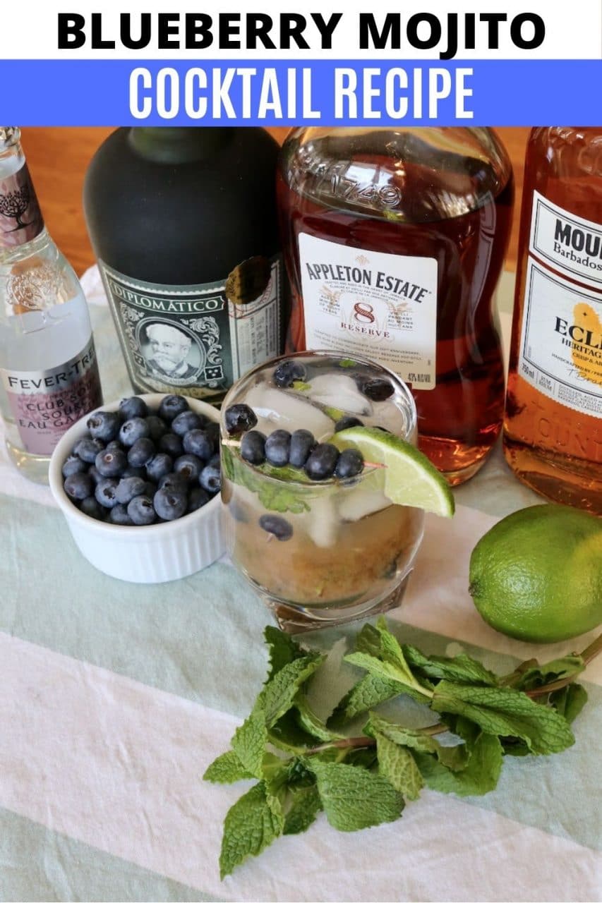 The homemade refreshing summer drink features premium rum, fresh blueberries, mint leaves, sugar, lime, and sparkling soda water.