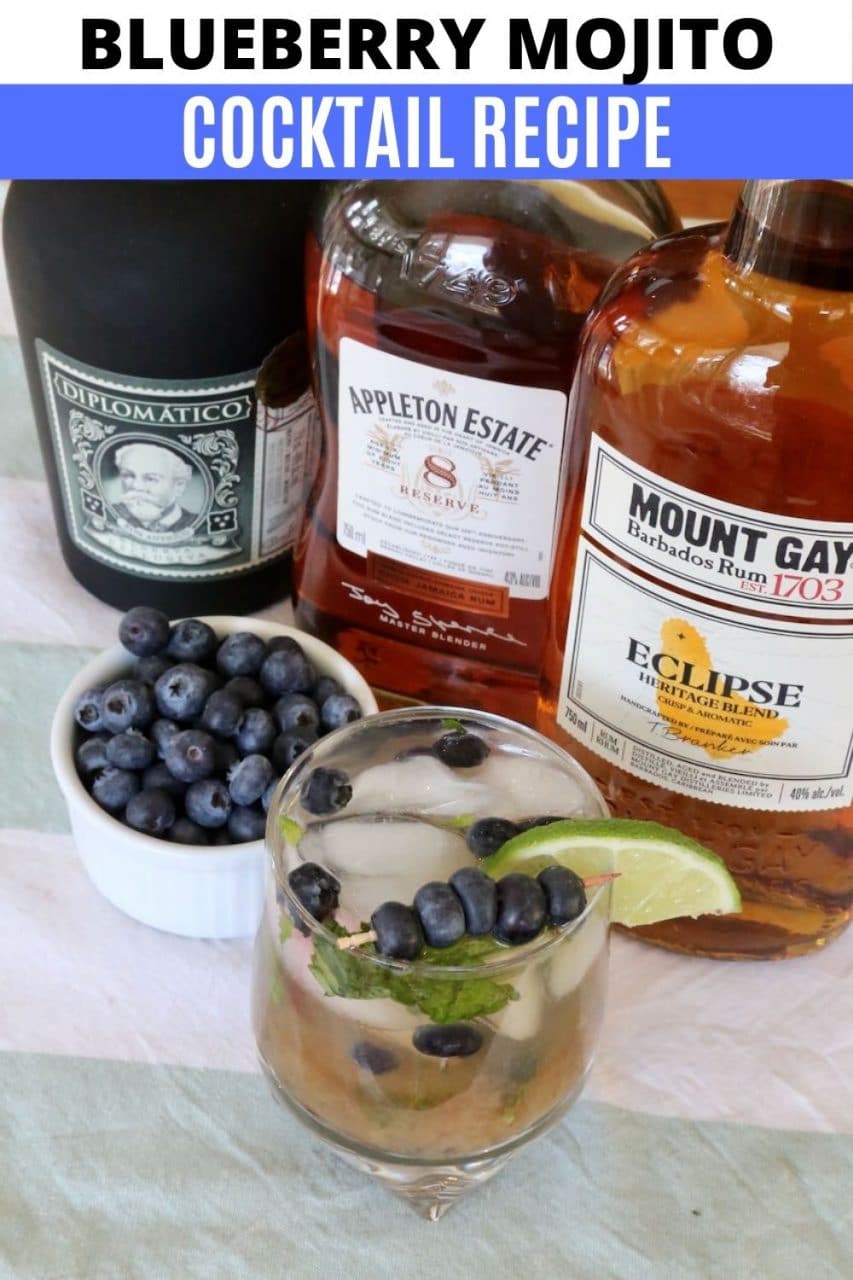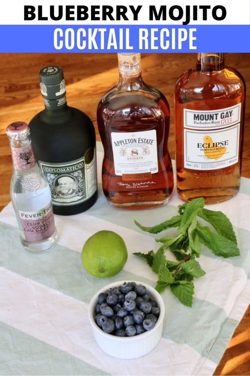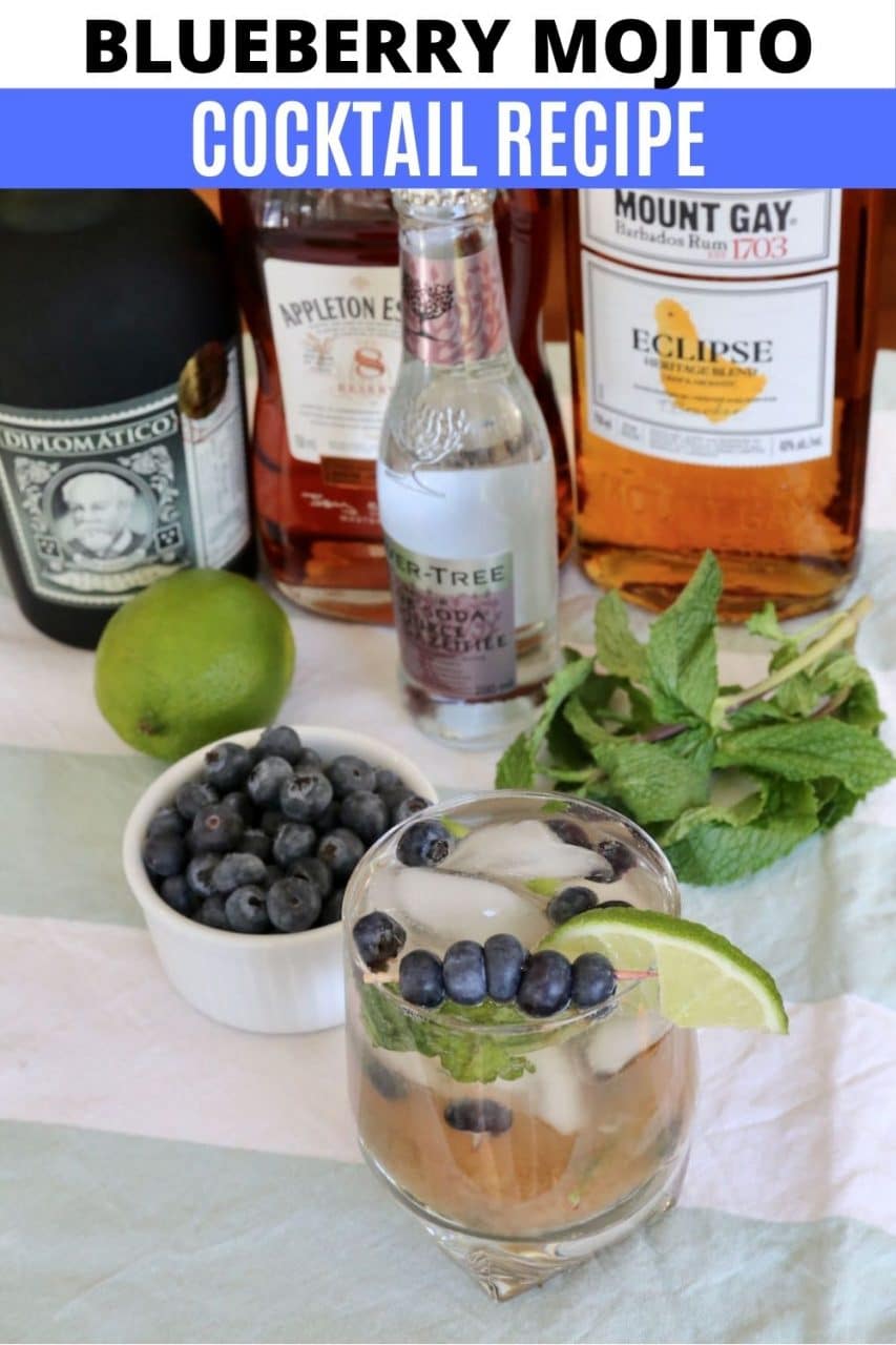 The homemade refreshing summer drink features premium rum, fresh blueberries, mint leaves, sugar, lime, and sparkling soda water.