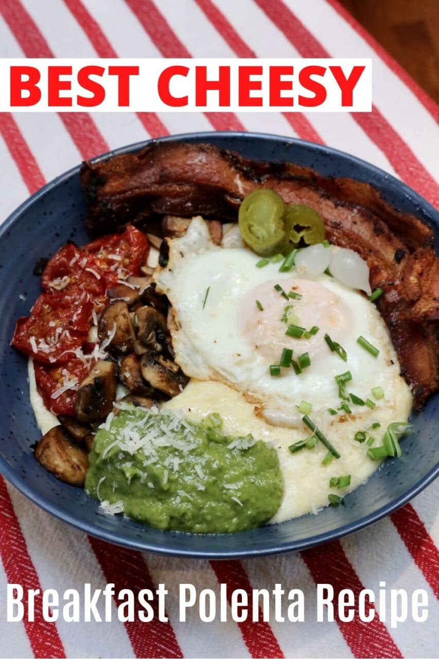 The best breakfast polenta is topped with eggs, bacon, tomatoes, mushrooms and guacamole.
