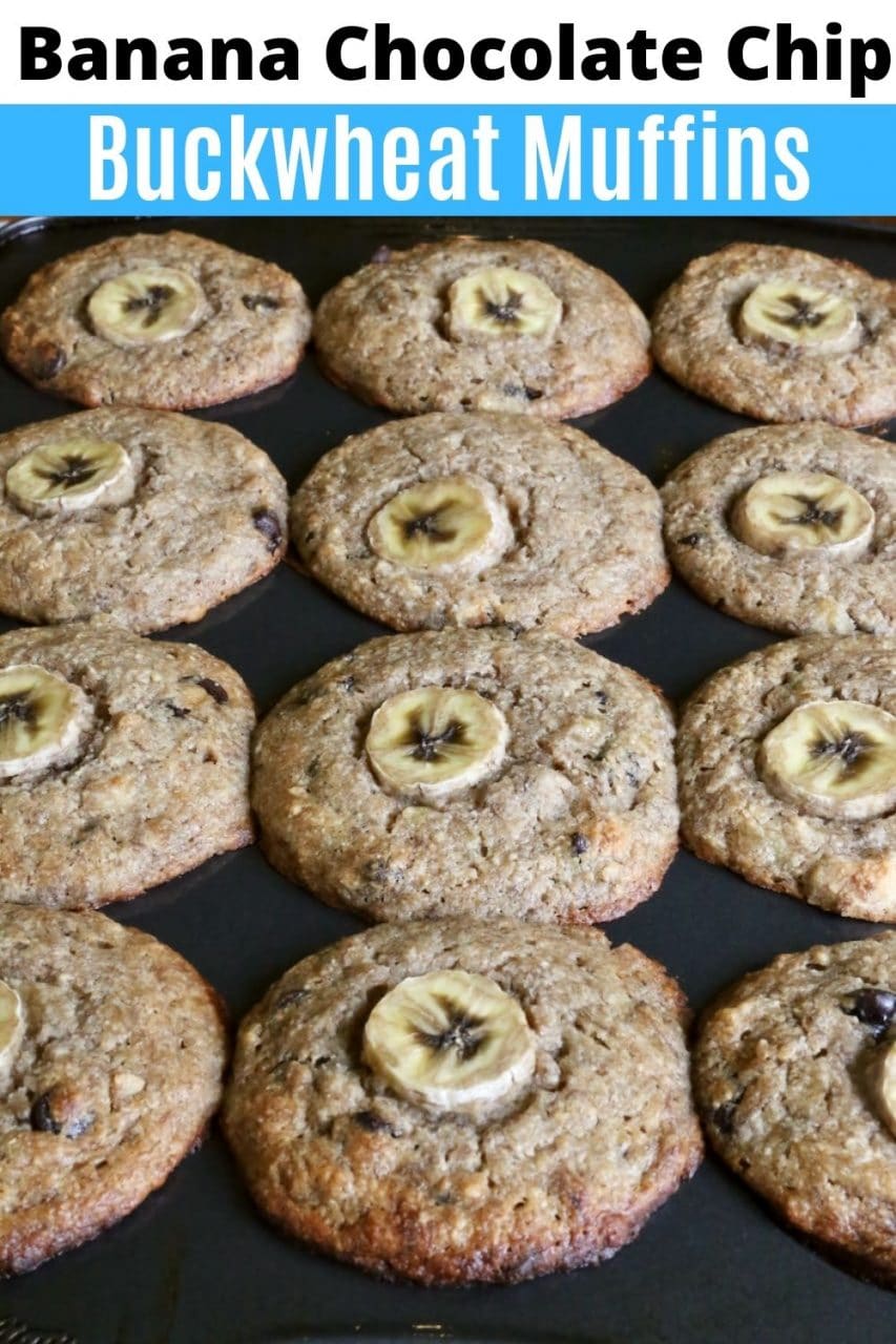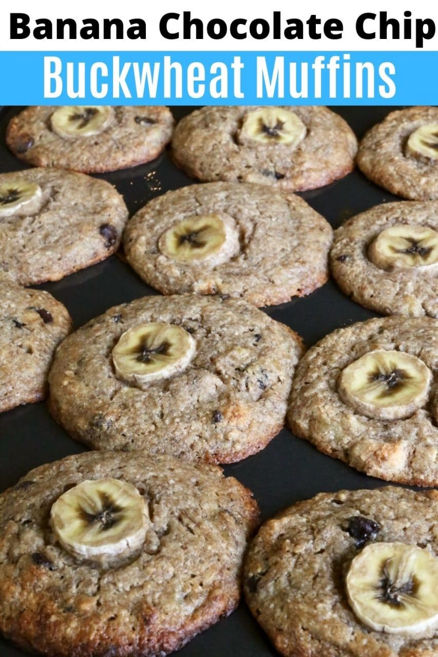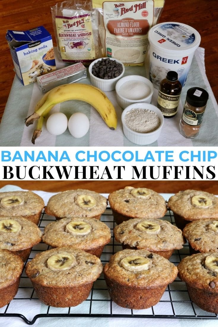 These healthy and nutritious gluten free muffins feature eggs, mashed ripe banana, Greek yogurt, buckwheat flour, oat flour, almond flour, cinnamon, nutmeg and semisweet chocolate chips.
