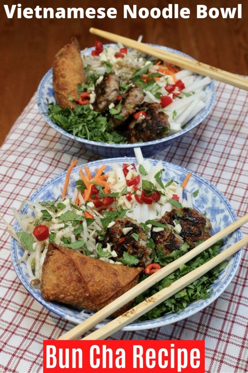 Our bun cha recipe is served as a hearty and healthy noodle bowl with Vietnamese pork & shrimp egg rolls. The bowls are large enough to fill you up at lunch or dinner.