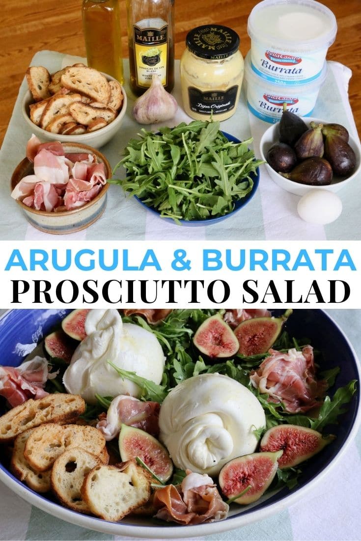Your friends and family will love forking through this easy homemade salad featuring ingredients like white wine vinegar, dijon mustard, olive oil, egg yolk, garlic, arugula, burrata mozzarella cheese, prosciutto ham, fresh figs and baguette crostini.