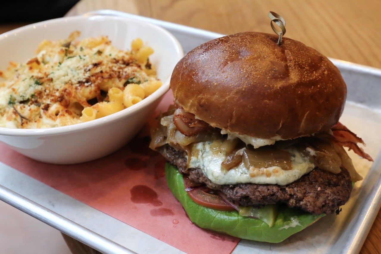 Bacon and Blue Cheese Burger | bacon, caramelized onions, dijonnaise, mustard, lettuce, tomato, pickles, blue cheese pate