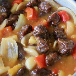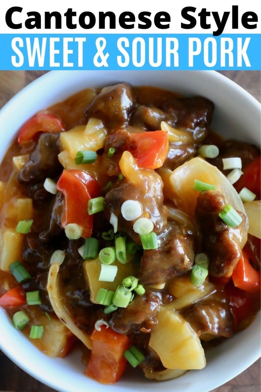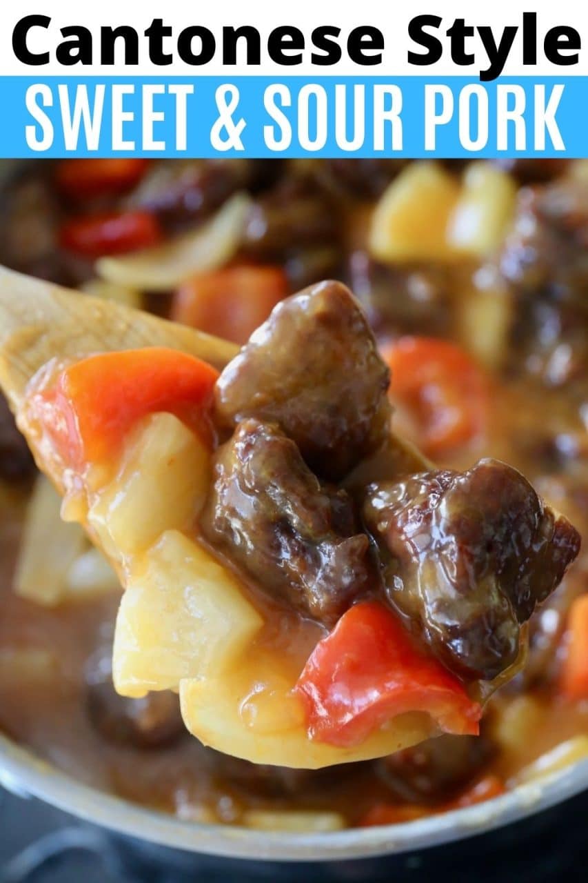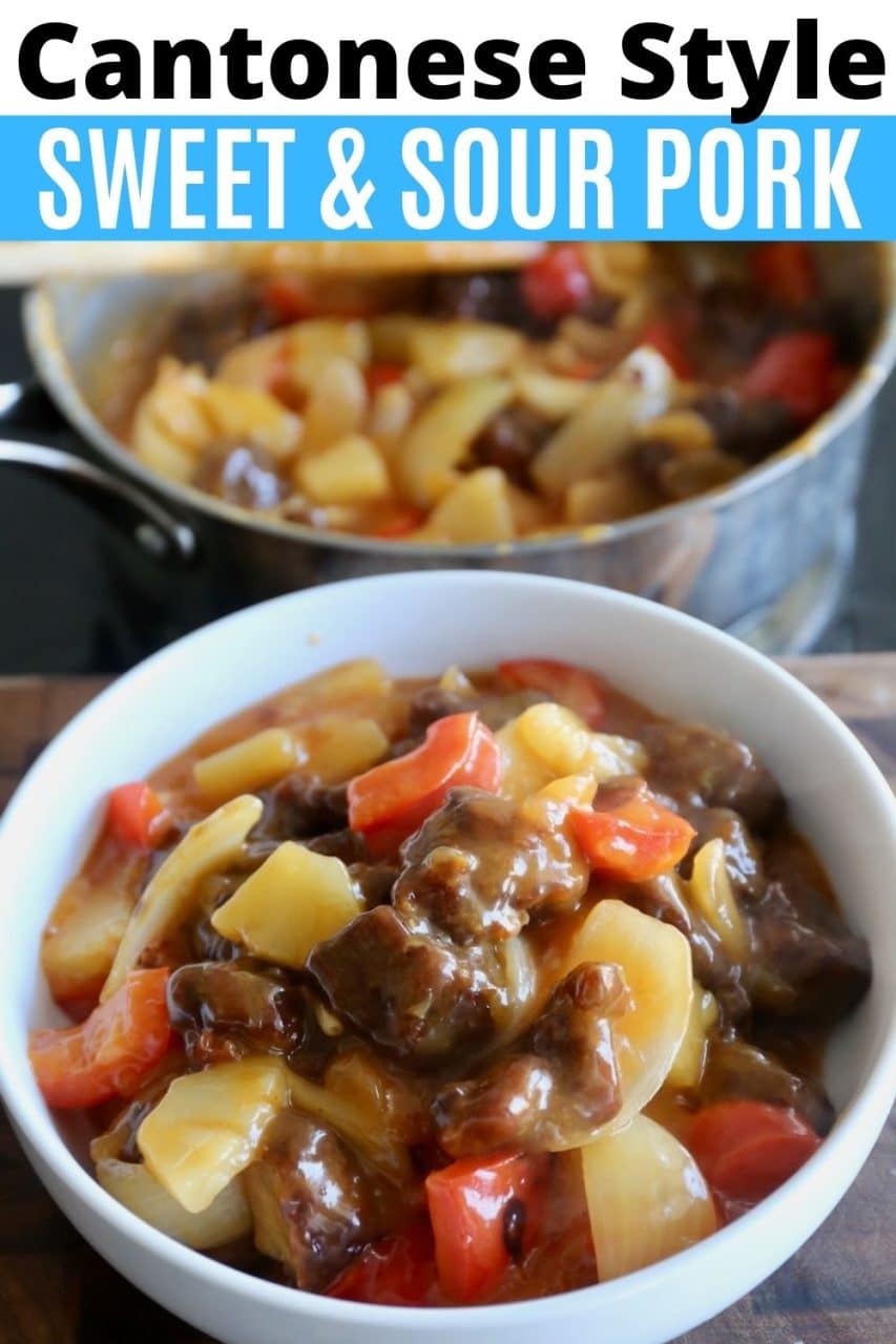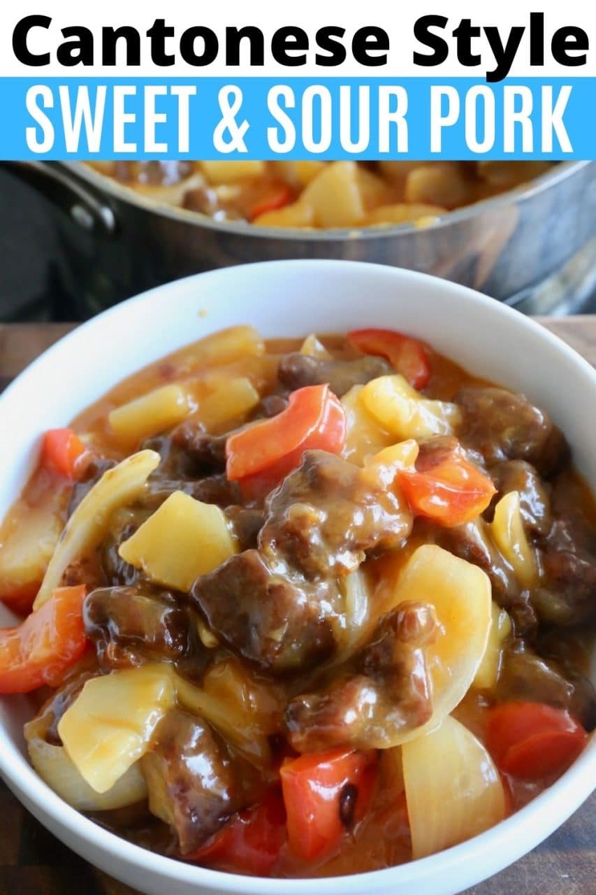 How to make Sweet and Sour Pork Cantonese style. Our easy homemade recipe tastes just like your Chinese restaurant favourite! Tender pork shoulder chunks are fried until crispy then tossed in a sweet and sour sauce with sweet bell peppers, onions and pineapple!
