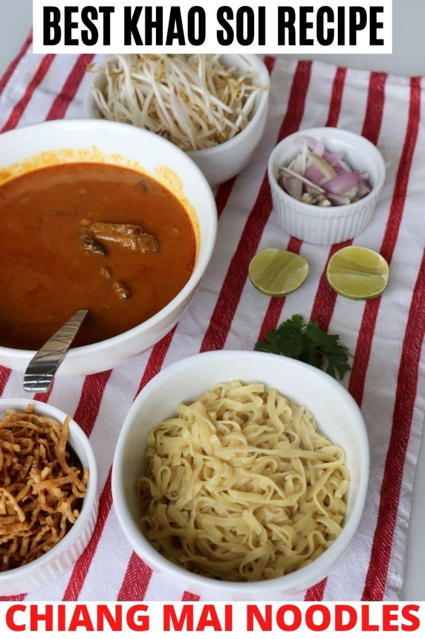- Assembly: Add a small handful of cooked egg noodles into the bottom of a large soup bowl. Ladle the Kao Soi curry sauce along with chunks of beef over the noodles. Garnish Chiang Mai Noodle bowl with crispy fried egg noodles, sliced shallots, chopped cilantro, bean sprouts and lime wedges. Serve with soup spoon and chopsticks.