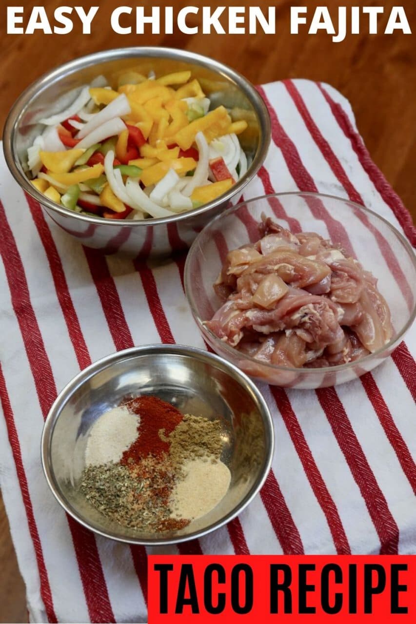 Our recipe for chicken fajita tacos suggests using boneless, skinless chicken thighs. The dark meat on a chicken is more flavourful thanks to the higher fat content. You can use chicken breasts but they dry out easily and aren’t as flavourful.