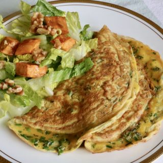 Our healthy vegetarian Ejjeh recipe features affordable ingredients like eggs, cream, scallions, parsley, chives, mint, salt, pepper, butter and olive oil.