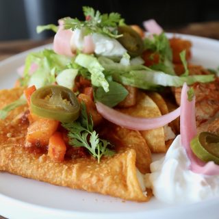 The cheese filled tortillas are then topped with tender chicken, carrot and potato stew and garnished with finely chopped lettuce, picked onions, cilantro, sour cream and jalapeños.