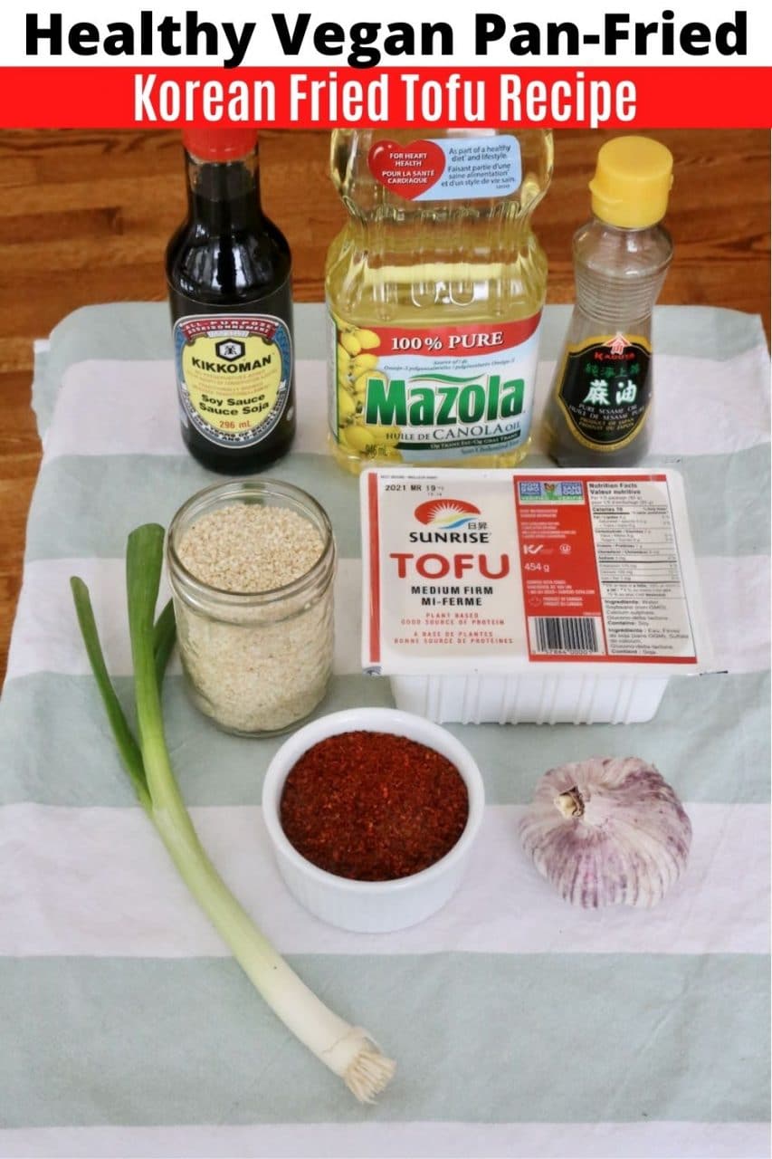 Traditional Fried Korean Tofu ingredients include soy sauce, scallions, garlic, white sugar, gochugaru Korean hot pepper flakes, sesame oil, sesame seeds and medium tofu.