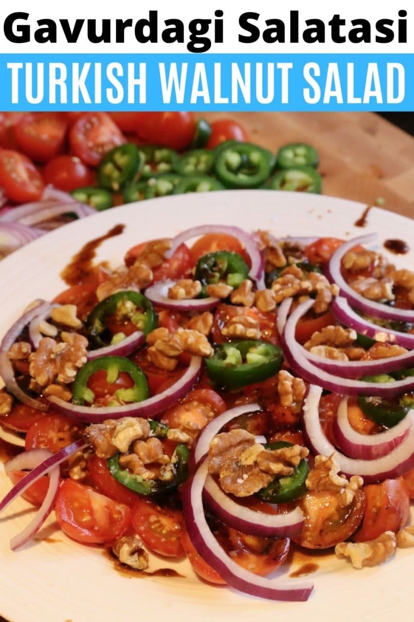 Gavurdagi Salatasi is a Turkish salad featuring tomatoes, peppers, onion, walnuts and pomegranate molasses dressing.