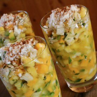 Known to locals in the central Mexican state of Michoacán as a mouth-watering street food, the healthy vegetarian recipe features finely chopped tropical fruits, garlic, onion, fresh mint and crumbled queso cheese like cotija.