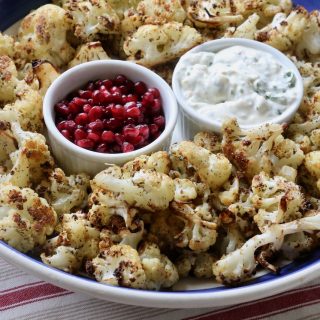 Our easy Lebanese Roasted Cauliflower recipe features crispy florets tossed in za’atar spice seasoning and served with a creamy yogurt, garlic and lemon sauce for dipping.