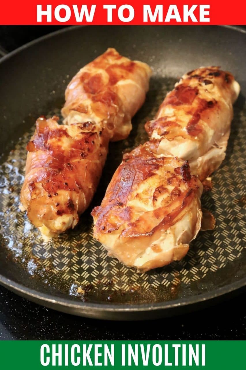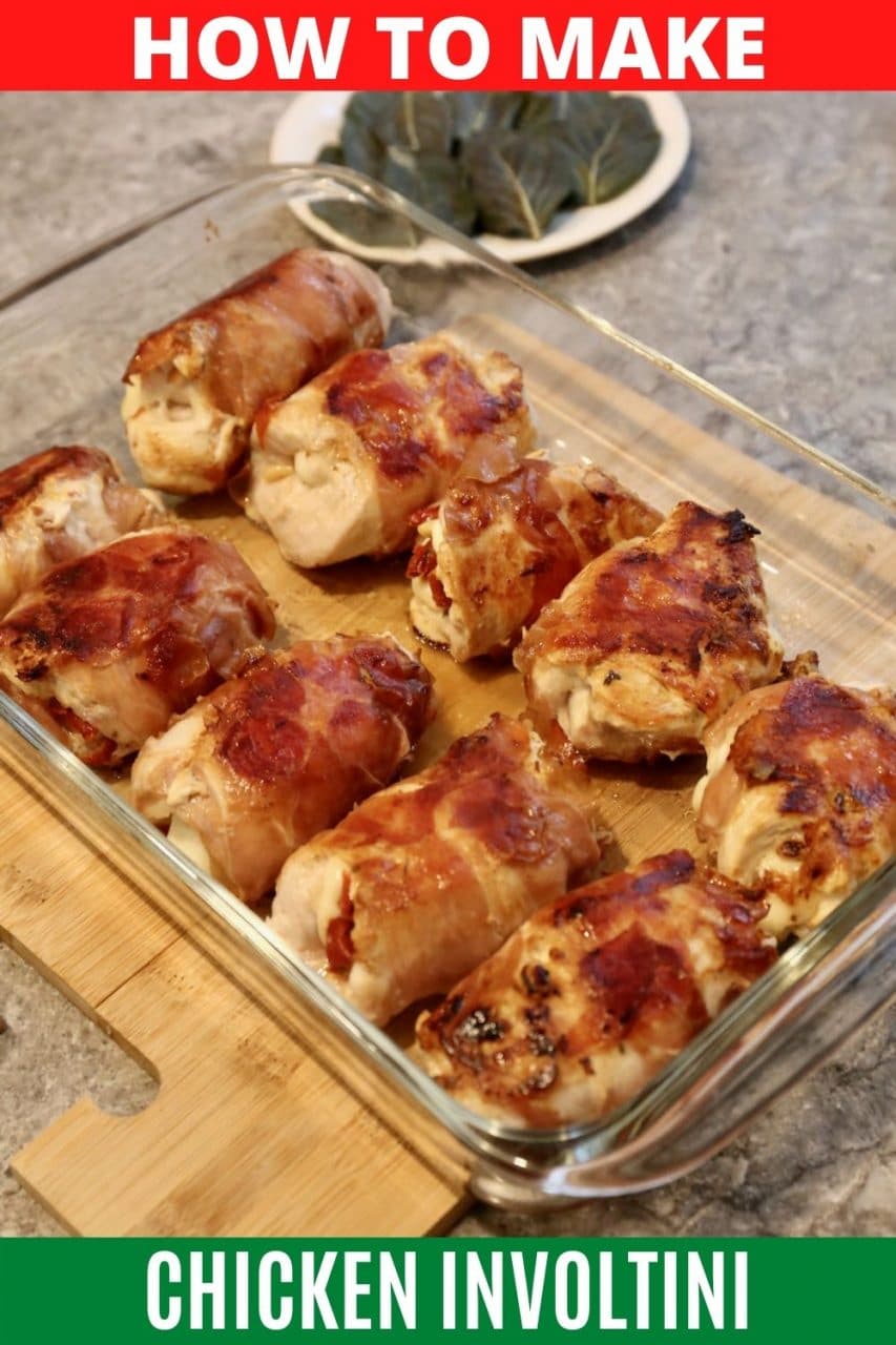 - Once browned on both sides add chicken involtini to a casserole dish and bake at 350 F oven for 20 minutes.