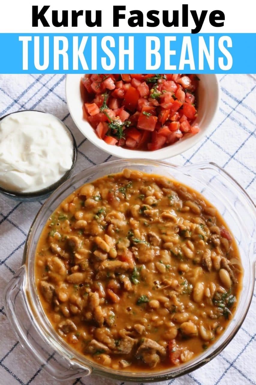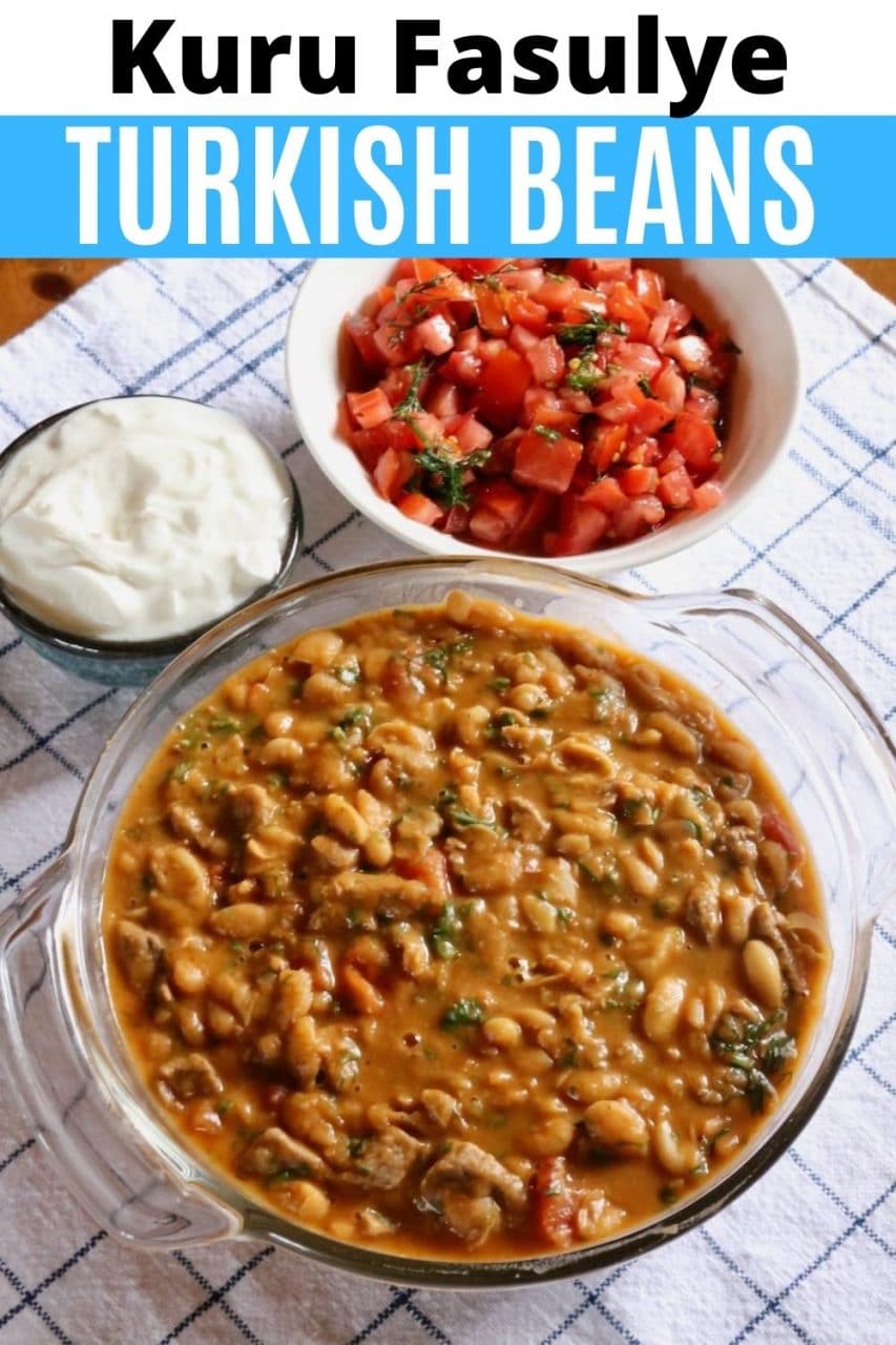 Kuru Fasulye is a popular stewed bean dish in Turkish cuisine. It is made primarily with white beans, onions, tomato and fresh herbs. Sometimes meat is added like chunks of stewing beef or pastirma cured beef.
