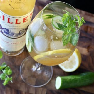 The best Lillet Spritzer is served in a large wine glass and filled with pretty lemon wheels, cucumber slices and fresh herbs like mint.