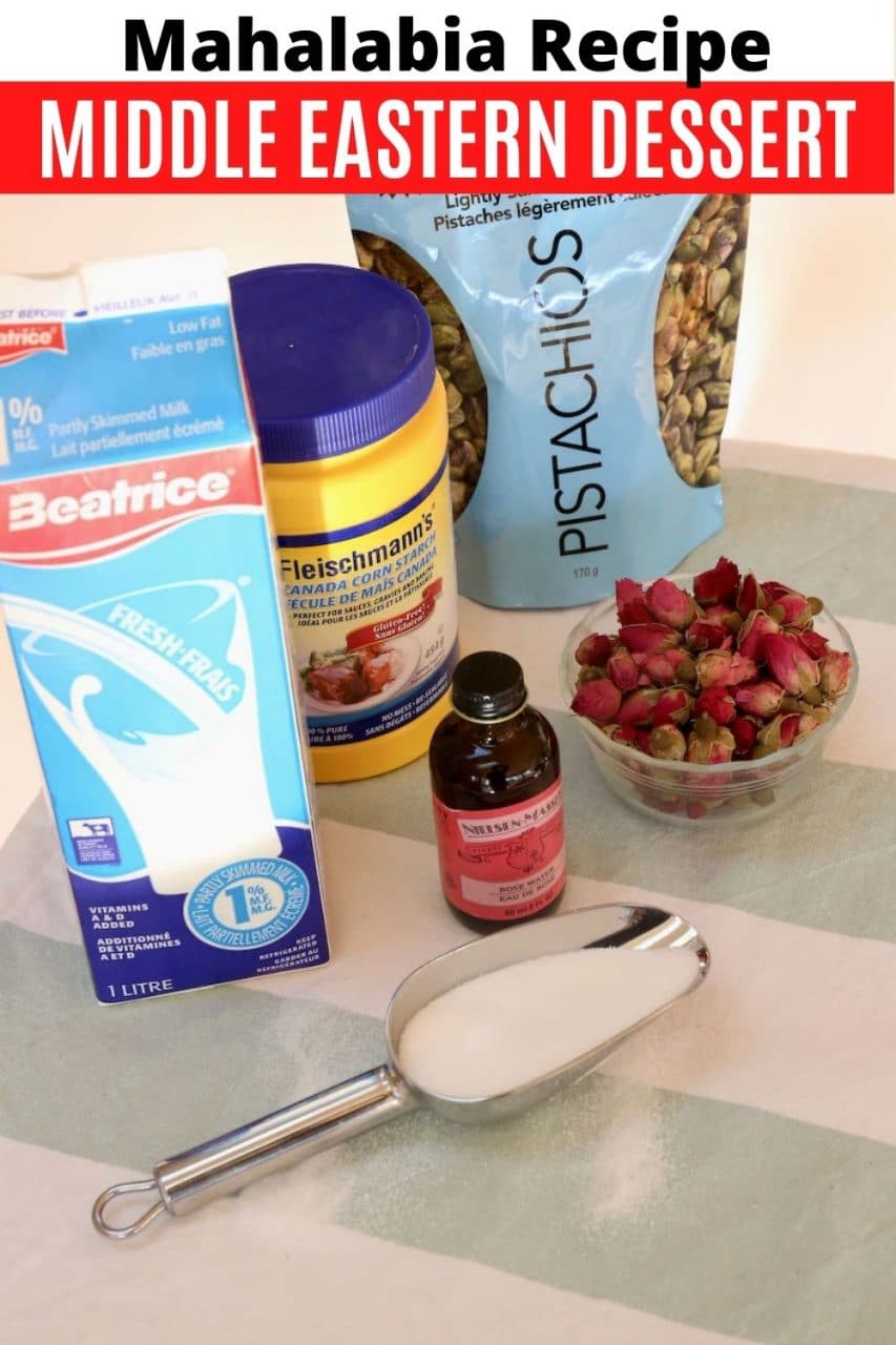 Our traditional Mahalabia recipe is prepared with affordable and easy to find ingredients like milk, cornstarch, rose water, white sugar, cardamom syrup, rose petals and pistachio nuts.
