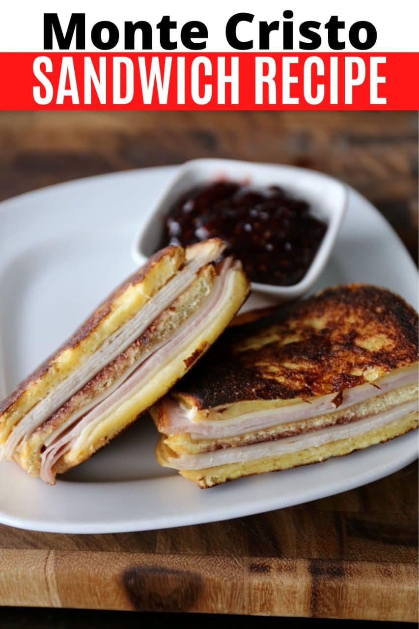 The Monte Cristo Sandwich is a classic American recipe featuring brioche bread slices, deli ham & turkey, Swiss cheese, raspberry jam, and a golden egg-dipped crust.