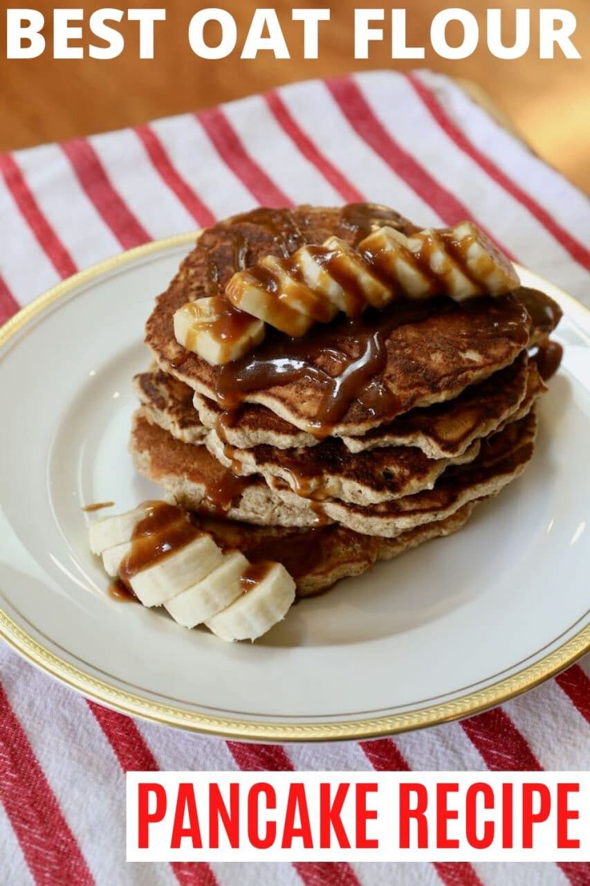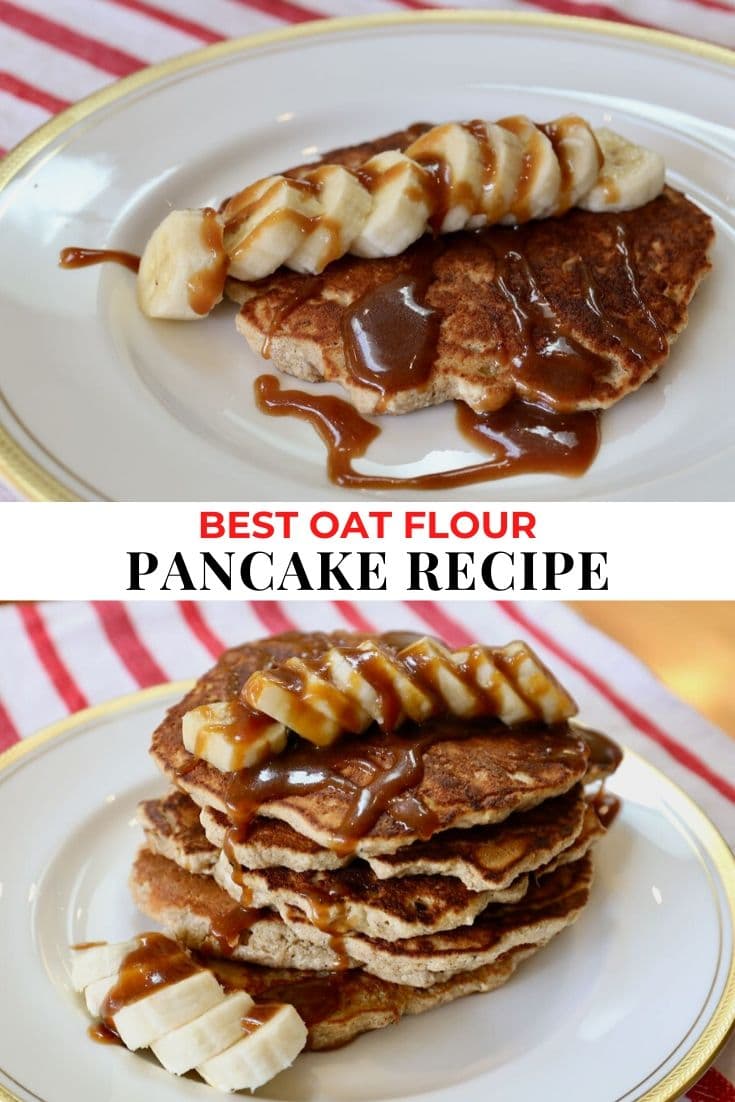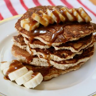 Many of my family and friends rank this recipe as the best oat flour pancakes recipe they’ve ever tasted. They sizzle in the pan or griddle into a perfectly crunchy and fluffy texture. The mashed banana in the batter adds structure to the flapjacks. Freshly sliced banana placed on top of a stack of pancakes pairs perfectly with homemade caramel sauce.