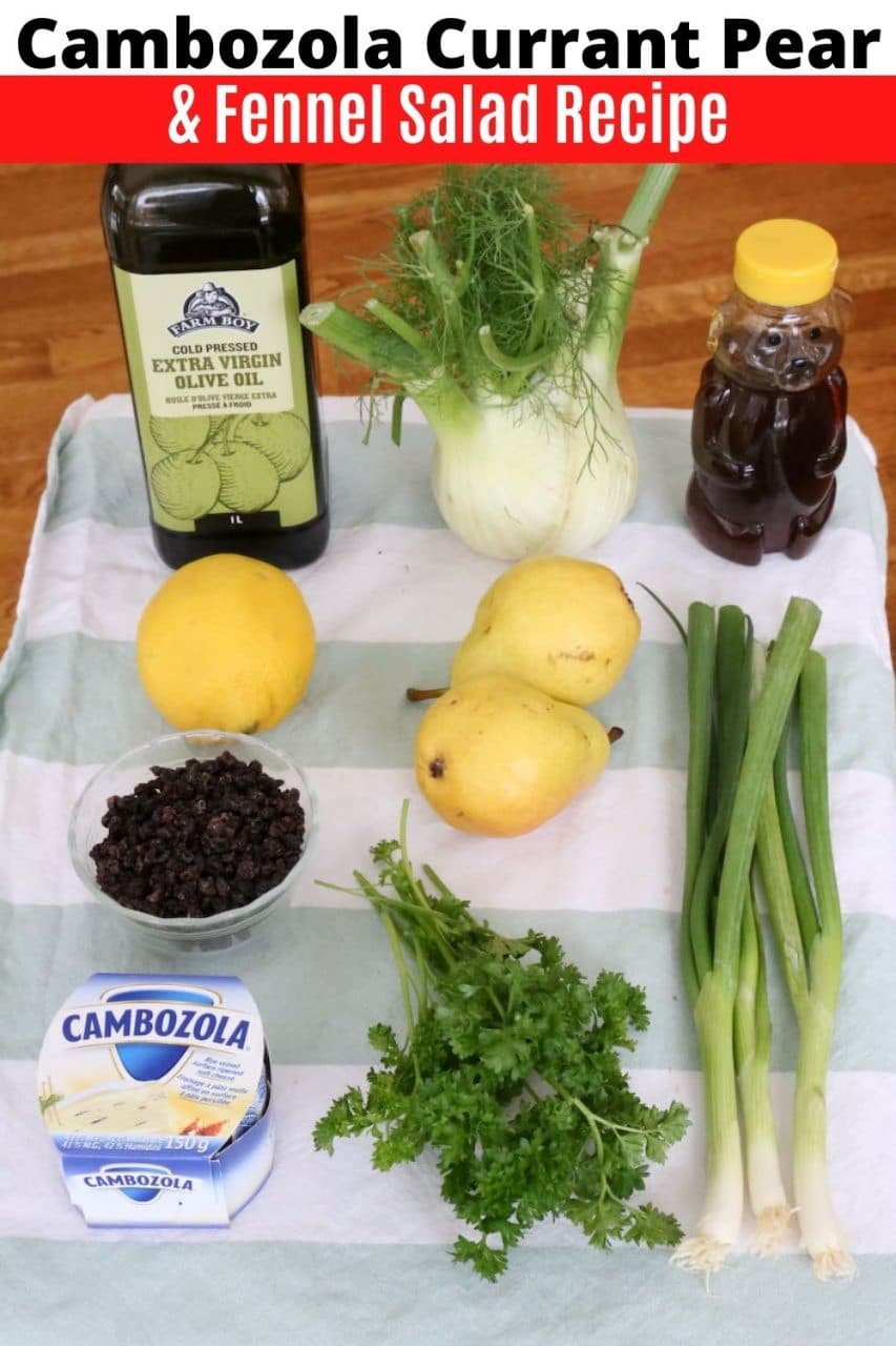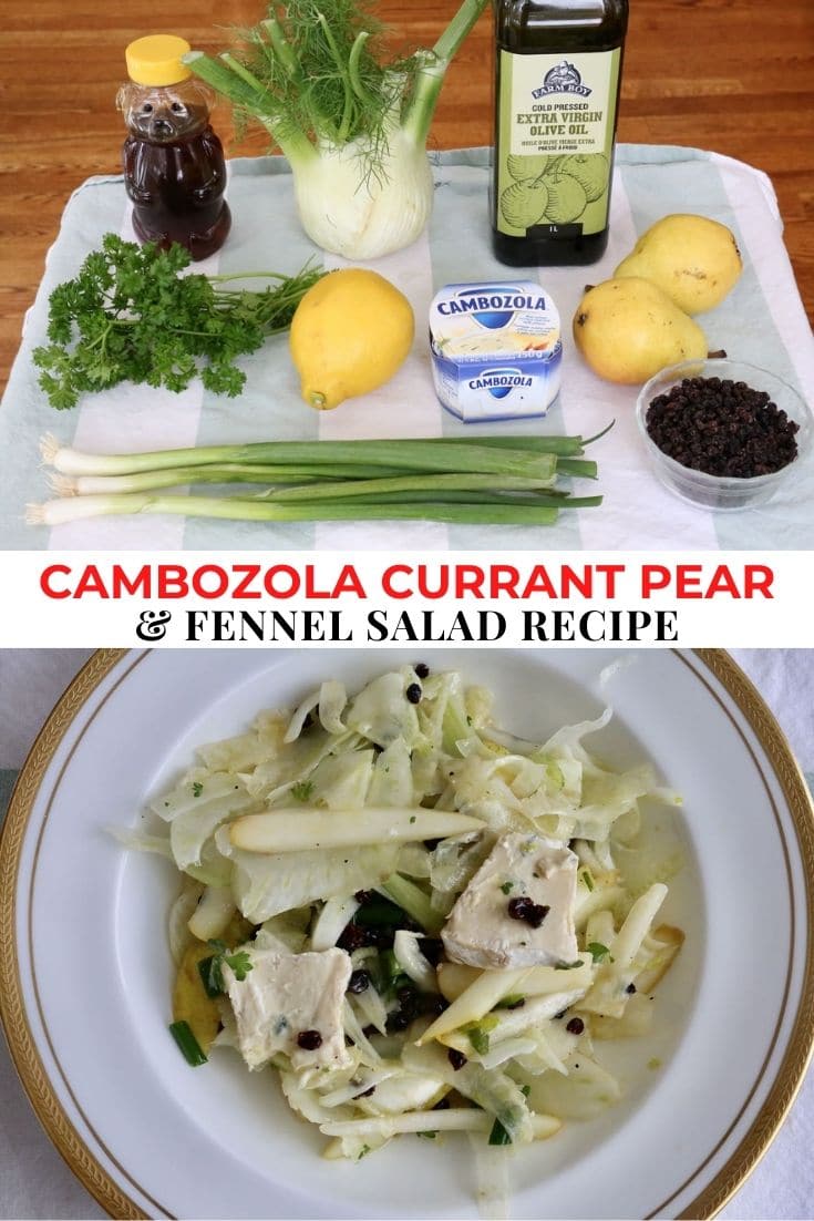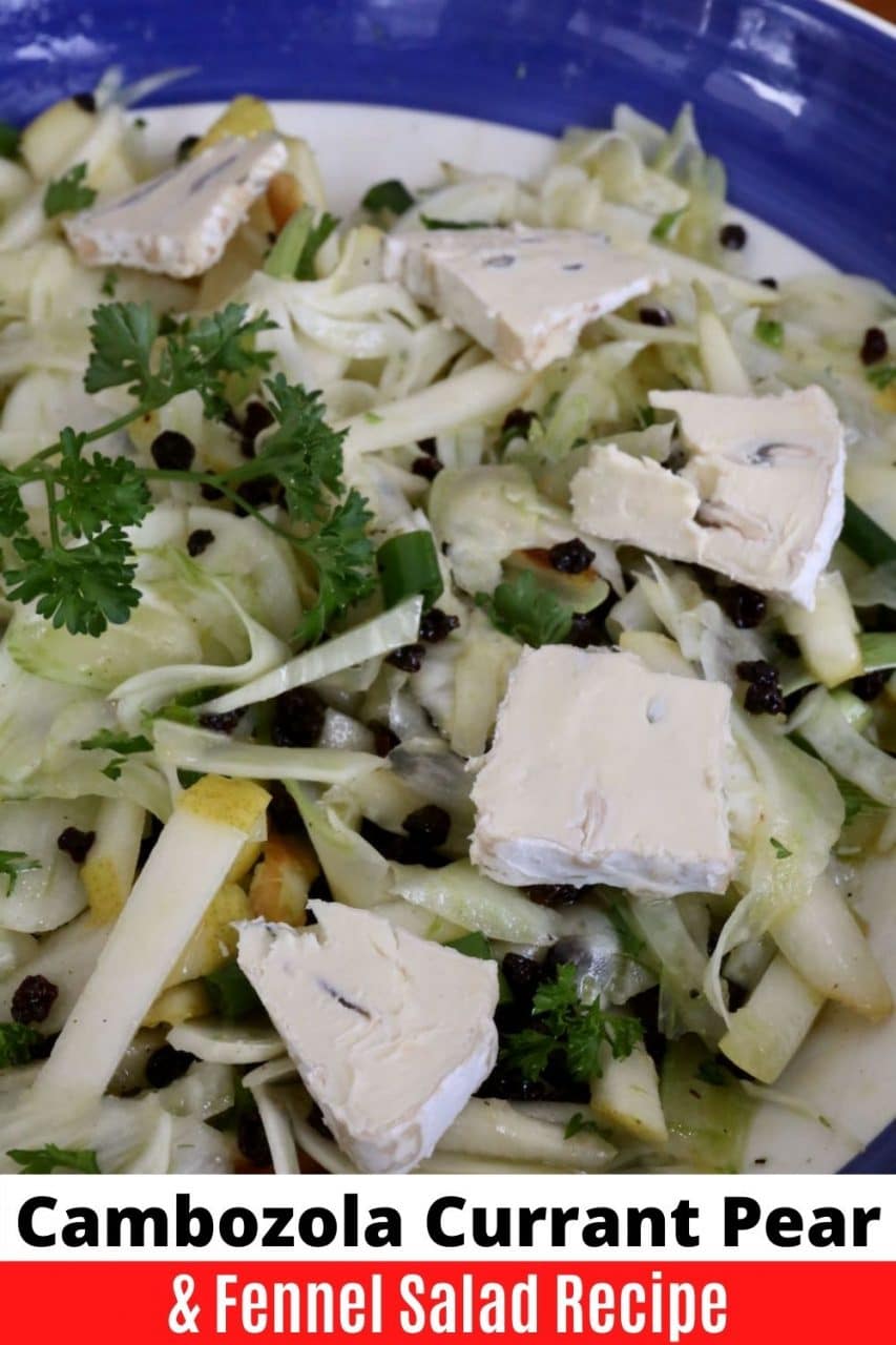 This crunchy and creamy Pear Fennel Salad features flavourful ingredients like lemon, honey, olive oil, currants, scallions, parsley and Cambozola cheese.