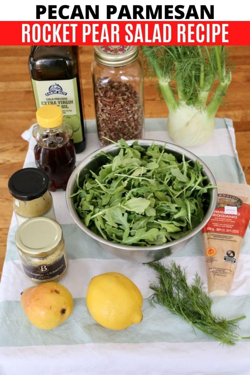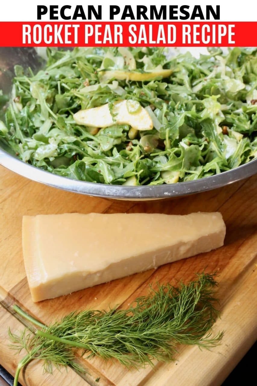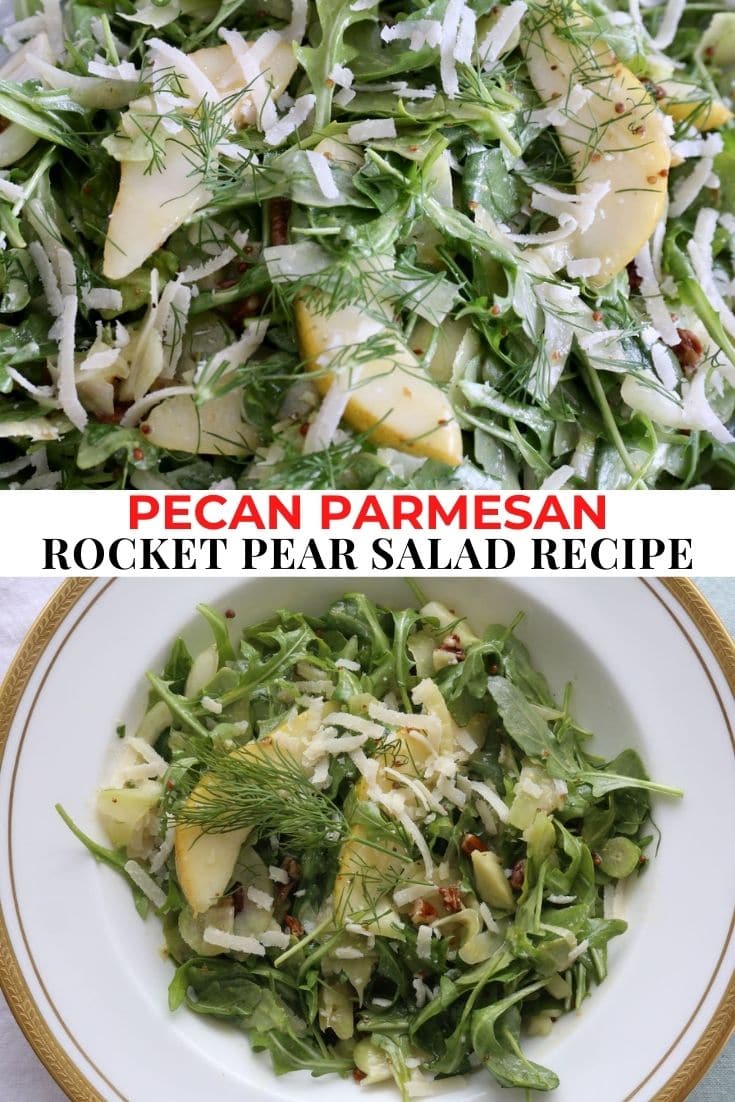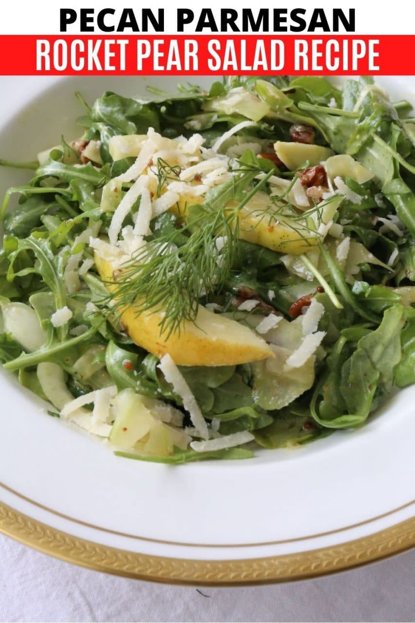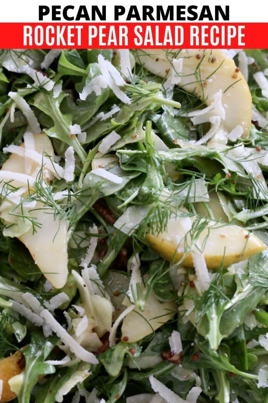 This crunchy and juicy Pear and Rocket Salad features flavourful ingredients like fennel, grainy mustard, dijon mustard, honey, lemon juice, olive oil, parmesan cheese and fresh dill.