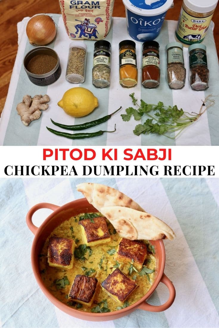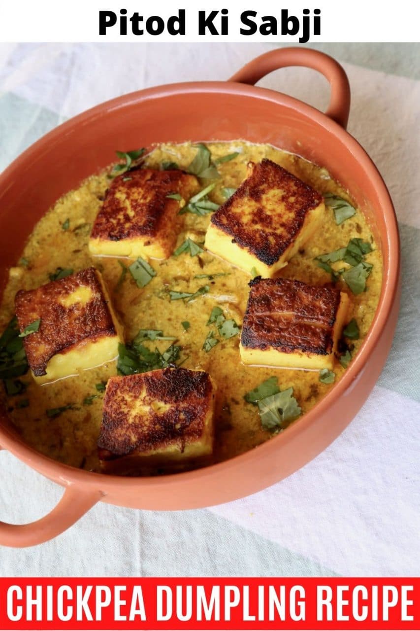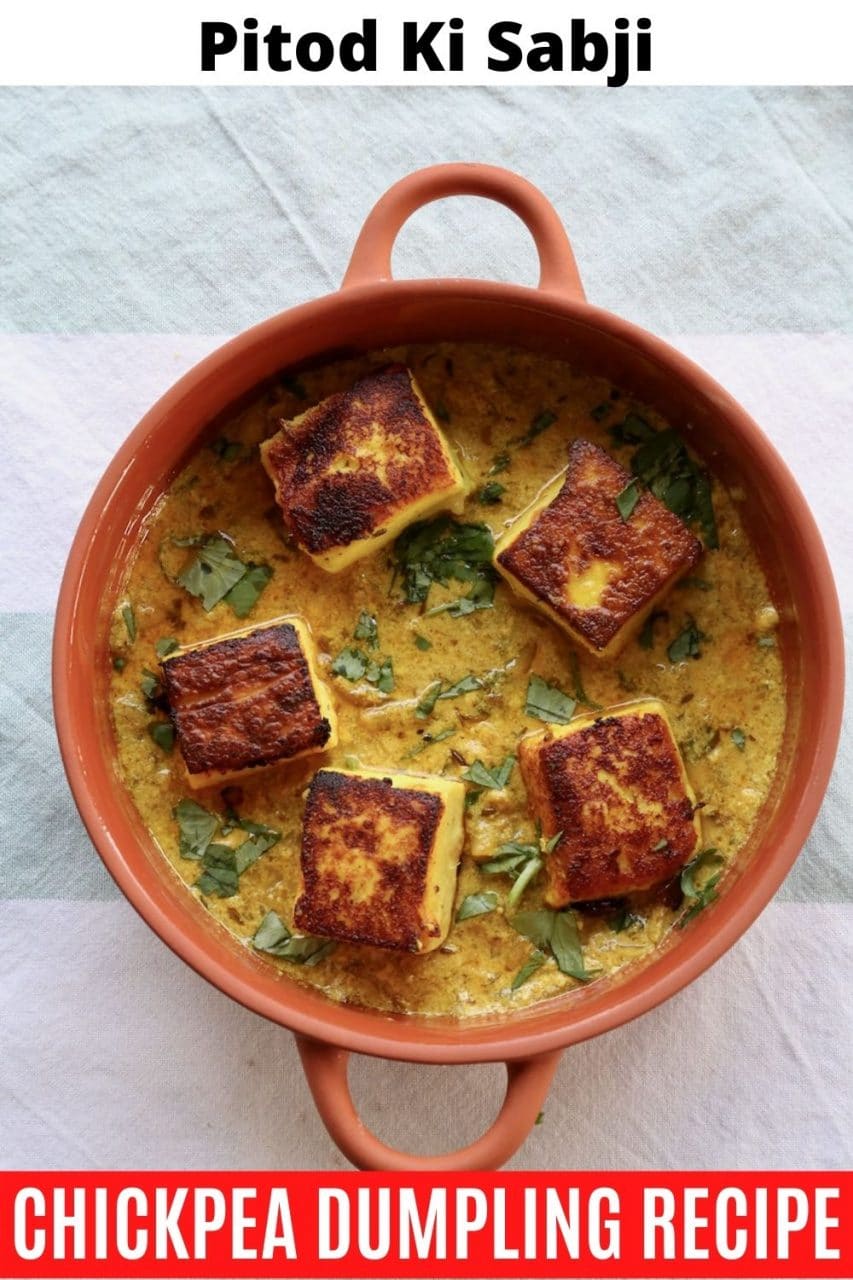 Pitod Ki Sabji is a dish popular in the province of Rajasthan. It features soft and plump Indian chickpea dumplings that are served in a creamy spiced curry sauce.