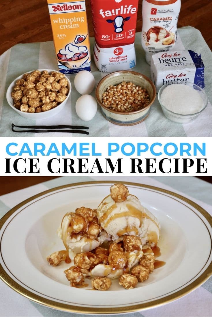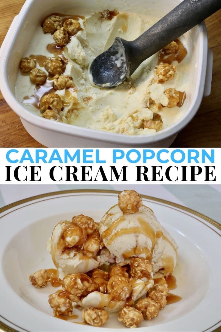 This easy ice cream recipe features two kinds of popcorn: buttered popcorn flavours the ice cream base and caramel corn pieces are mixed into the churned cream and a decorative topping.