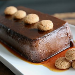 Once chilled Bonet alla Piemontese is inverted on a plate, the remaining caramel spooned over the top and served with amaretti cookies.