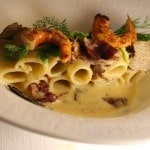 carbonara, beef bacon, summer black truffle, roasted red prawns