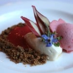 rhubarb strawberry puree, sweet honey cream, orange, basil, brown butter crumble