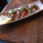 Maguro Tataki: lightly seared BC albacore tuna sashimi with ponzu sauce and garlic chips.