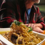 Thai curry with tamarind and cooked with onions, peanuts, potatoes and bay leaves, crispy fried shallots