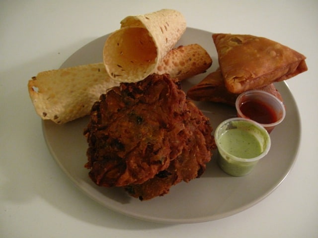 Vegetable Samosa: crispy patties stuffed with potatoes and peas.