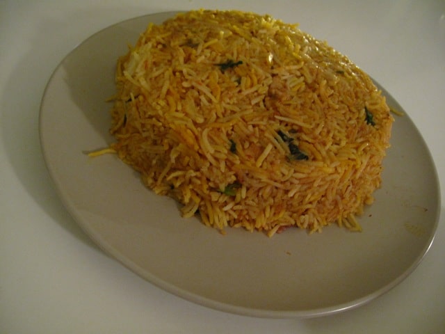 Chicken Biriyani: chicken cooked with basmati rice, mint leaves, yogurt and ground spices.