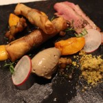 smoked breast, spring roll, parfait, apricot, pistachio crumble, toasted brioche