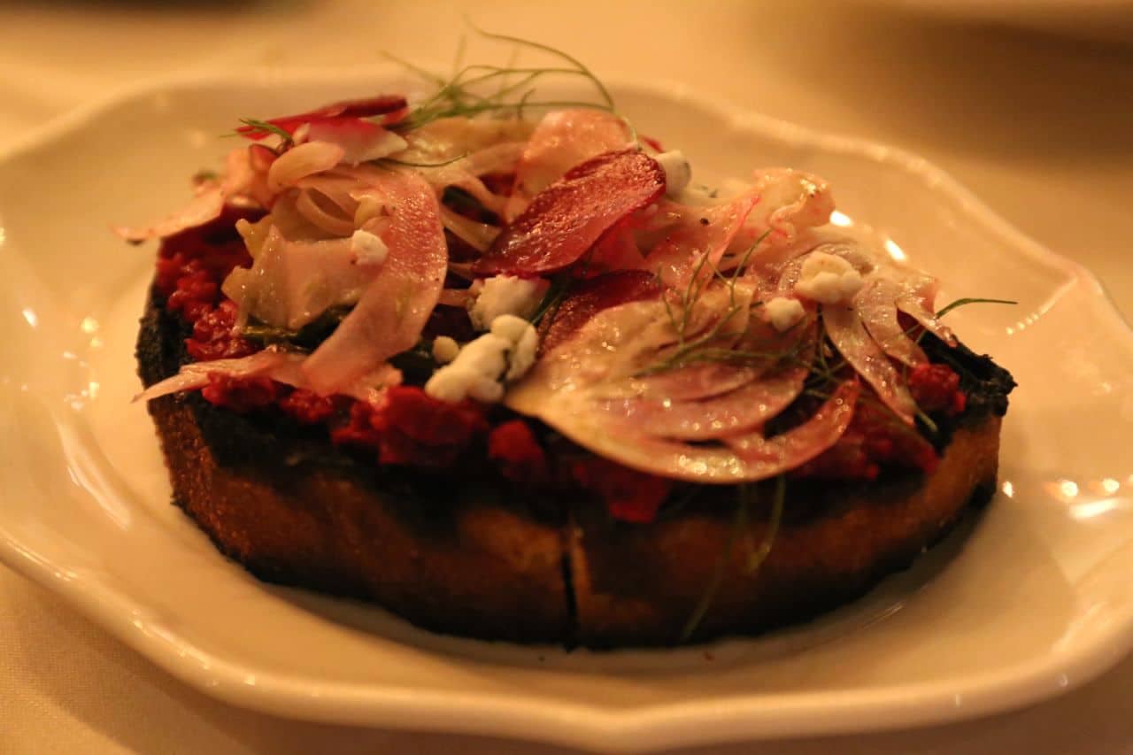 We started off the evening by scooting up to the hotel’s Salone Nico bar. The bartenders here successfully celebrate the European tradition of afternoon aperitifs and low-proof cocktails. We whisked our Blueberry Cobbler and simply titled Gilder into the dining room, sipping through sweet liquid while running our fingers through the restaurants menu.