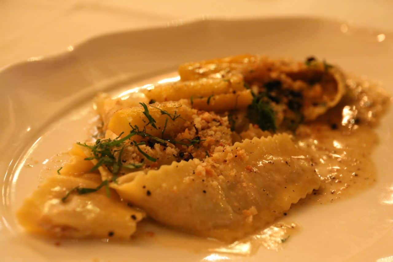 Our farewell feast started with a duo of crudo, glistening Kanpachi and Hamachi adorned with whispers of chervil, pink gooseberry and hen of the woods. Our hearts stopped as we tackled a large plate of Softshell Crab alla Romana. We eagerly dipped creamy ricotta stuffed crispy into salsa verde and agro mosto before pitching into mouths ajar.