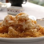 We started off the meal with a glass of champagne, a wink for my “salut and so long.” Throughout lunch our server who wore a white dress jacket and black bow tie moved around the table like a silent wind, placing piping hot plates under our noses. Our BBQ trilogy forced a few vocal “omg’s,” heaven where crispy meets juicy meets fatty. Deep fried prawns tossed in sweet mayonnaise and sesame perched in a fried egg nest were followed by wok fried shredded beef so tender you really didn’t even have to bother with the labours of chewing.
