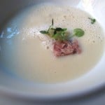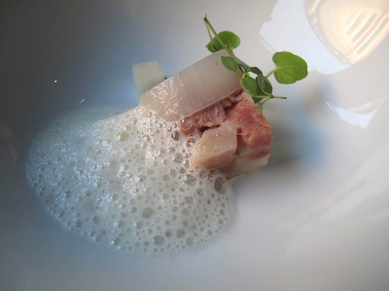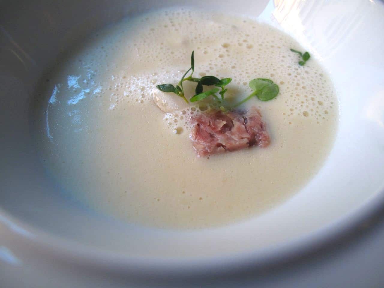 jerusalem artichoke soup with cured knuckle of pork, shallots and apple