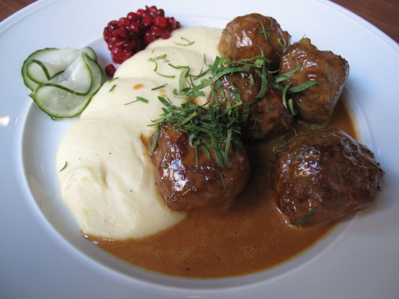 meatballs, mashed potato, cream sauce, pickled cucumber, lingonberries