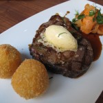aged dried entrecote, potato croquettes, marinated root vegetables and roasted garlic butter