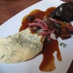 red wine braised ox cheek with onion, pork belly and mushroom ragout with potato and celery pure