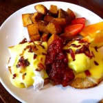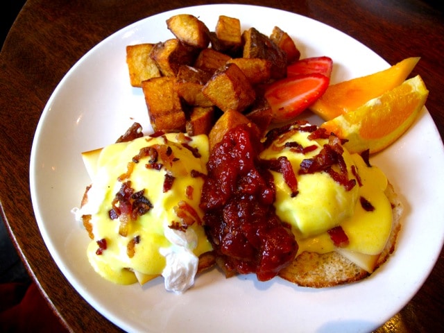 Eggs Parliament with two poached eggs on toasted english muffin topped with smoked mozzarella and crispy double smoked bacon, plum tomato chutney with hollandaise sauce served with homefries.